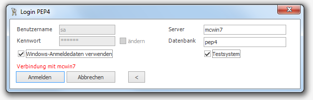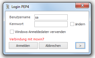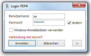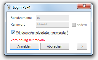 Wenn PEP4 so eingerichtet ist, dass dein AD-Account (Active Directory) verwendet werden kann, dann aktiviere Windows Anmeldedaten verwenden: