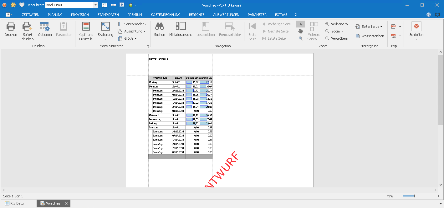 Die Tabelle wird so wie angezeigt in die Druckvorschau übergeben. Hier hast du die Möglichkeit, den Drucker zu wählen, Ränder anzupassen, Wasserzeichen oder Kopf- und Fusszeilen zu ergänzen.