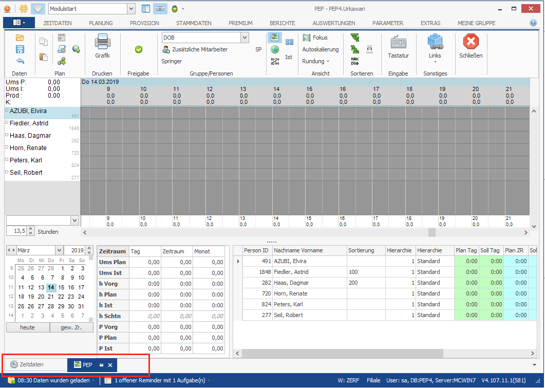 Ein Modul wird immer nur einmal gestartet: Öffnest du also zunächst Modul Zeitdaten (1001) und danach PEP (2001) und klickst dann wieder auf Modul Zeitdaten, dann wird das bereits vorhandene Fenster Zeitdaten wieder in den Vordergrund gebracht.