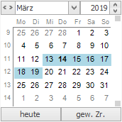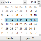 Um einen einzelnen Tag auszuwählen, klickst Du auf das Datum; um einen Zeitraum zu wählen, klickst Du auf das Start-Datum und hälst die Taste gedrückt, während du die Maus ziehst: