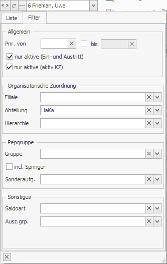 Wenn nur Personen eines Bereiches (z.B. Filiale, Abteilung, Gruppe) angezeigt werden sollen, dann kann man die Liste filtern. Öffne dazu das Steuerelement und klicke auf den Filter. Wähle hier z.B. eine (oder mehrere) Abteilungen.