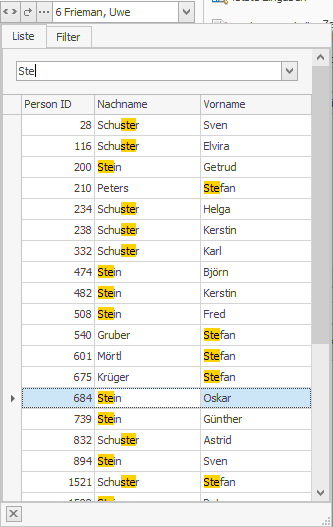 Um eine Person zu suchen, kann man direkt mit der Eingabe eines Suchbegriffes in das Suchfeld beginnen. Die Liste wird gefiltert und alle Fundstellen werden markiert: