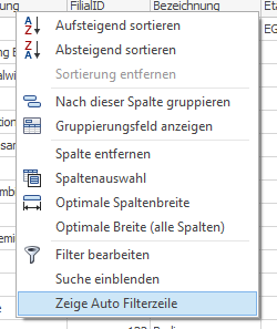 Wenn die Filterzeile nicht eingeblendet sein sollte, dann kann Du mit einem Rechtsklick auf den Tabellenkopf das Menü aufrufen und die Zeile einblenden: