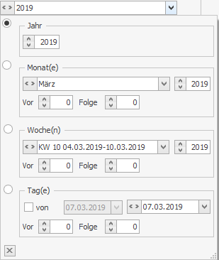 Du kannst bei Monaten, Wochen und Tagen auch Vor- und Folgezeiträumen wählen, z.B. Januar + 2 Folgemonat entspricht den Zeitraum Januar bis März.