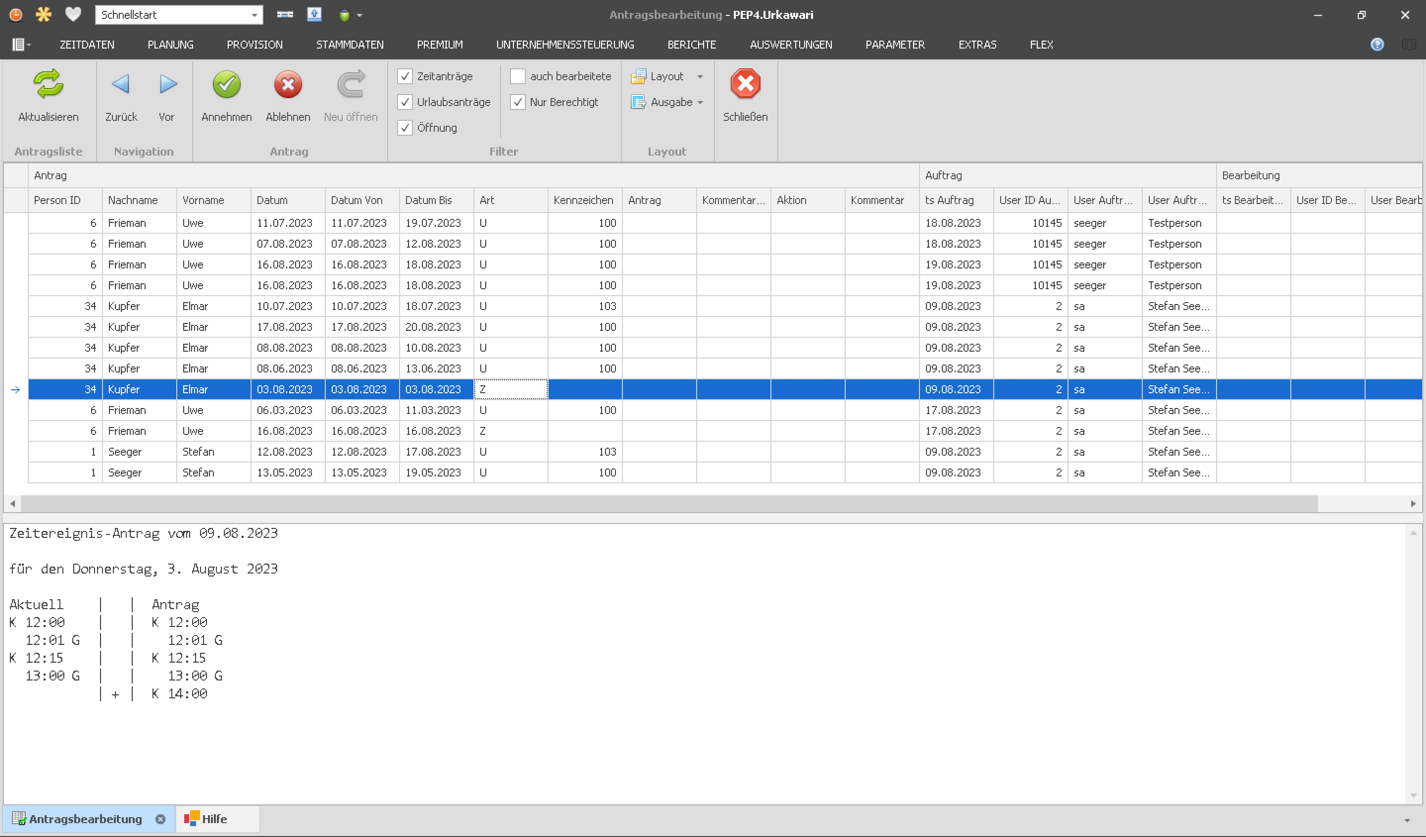 In den Rechten kann unter „Wert4“ bestimmt werden, welche Kennzeichen / Arten für den Personenkreis Freigegeben werden dürfen. Eine Einstellung von „A;100;200“ erlaubt damit einen Abwesenheitsantrag für die Kennzeichen 100 und 200.