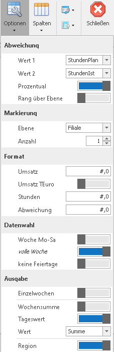 Du kannst selbst bestimmen, welche Abweichung berechnet werden soll. Zum Anzeigen der Abweichung muss auch die Spalte Abweichung aktiviert sein. Die Reihenfolge von Wert1 und Wert2 spielt dabei eine Rolle. So ist die Abweichung Umsatz Plan - Umsatz Ist ein andere als Umsatz Ist - Umsatz Plan.