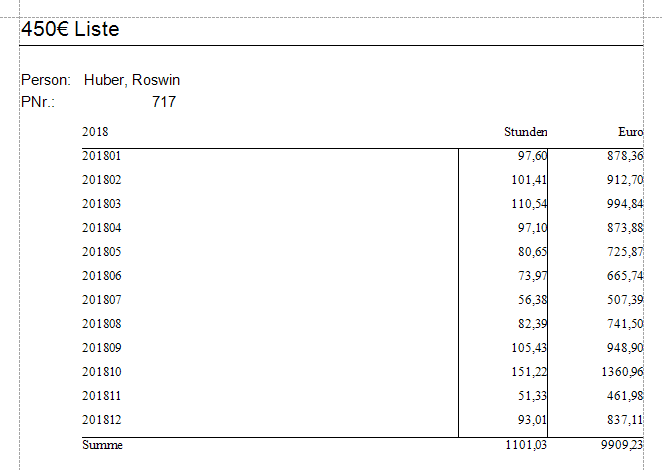 Gibt einen Bericht über die Verletzungen von Arbeitszeiten aus, d.h. man kann je Mitarbeiter Grenzen definieren. Alternativ kann dieser Bericht genutzt werden, um bei geringfügig Beschäftigten die Einhaltung der 450€-Grenze zu überwachen.