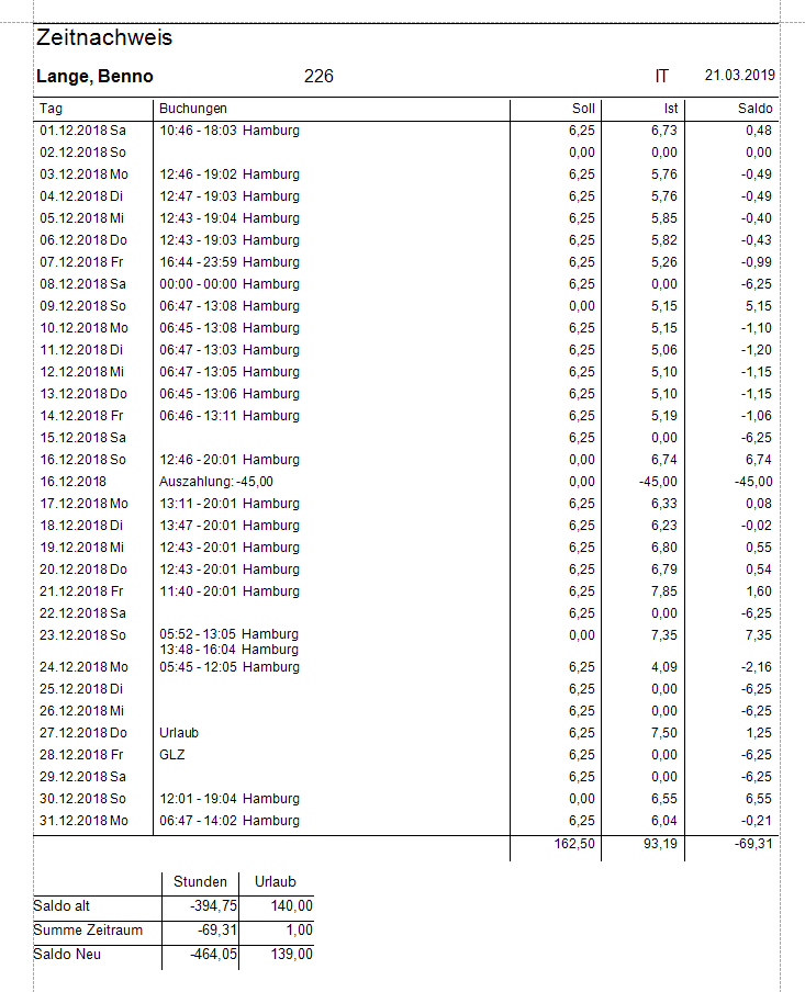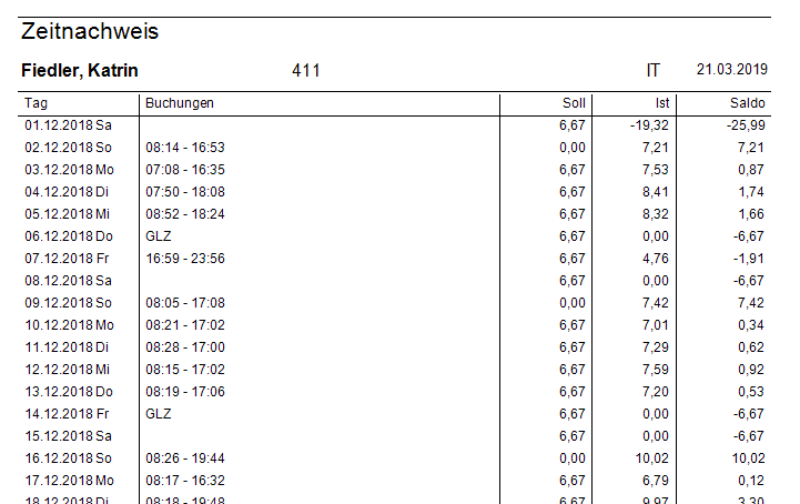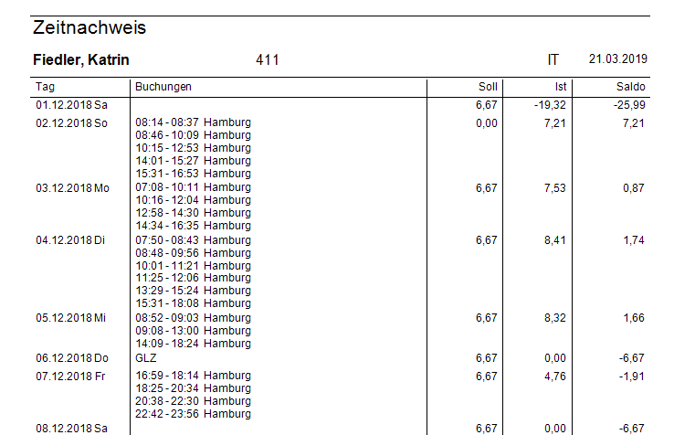 Im Bericht werden die Zeitbuchungen eines Tages zu einer Summe zusammengefasst und summiert. Beispiel 3h Anwesenheit + 4h Dienstreise = 7h. Wenn auf dem Datum eine Auszahlung gebucht ist, dann wird diese auch hinzugerechnet, Beispiel Auszahlung - 30h, ergibt einen Tagessaldo von -23h.