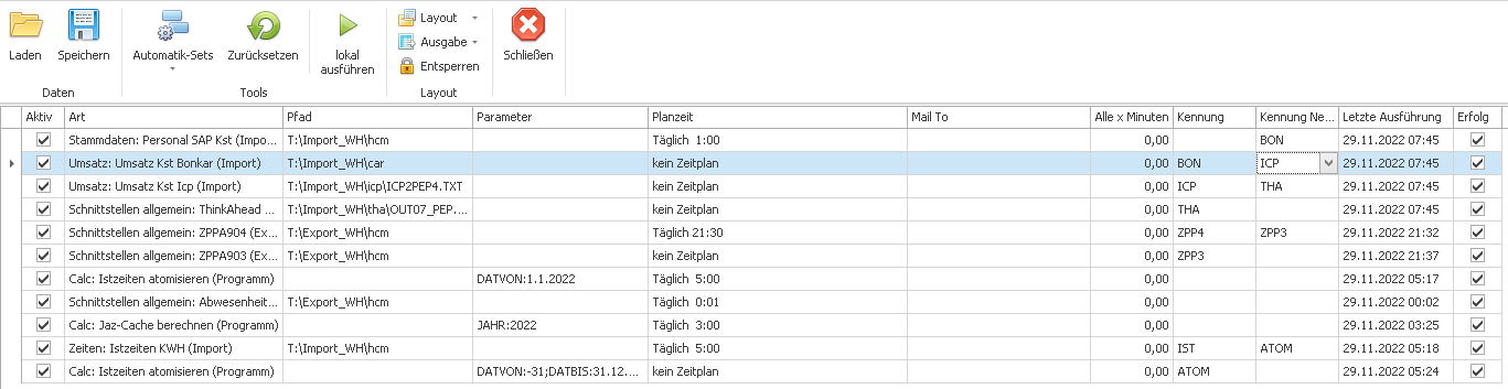 In dem obigen Schaubild kann daher „Stammdaten Personal“ zurückgesetzt werden, da es hier einen Zeitplan gibt. Danach wird das Programm mit der Kennung BON ausgeführt, danach ICP, THA und Ende.