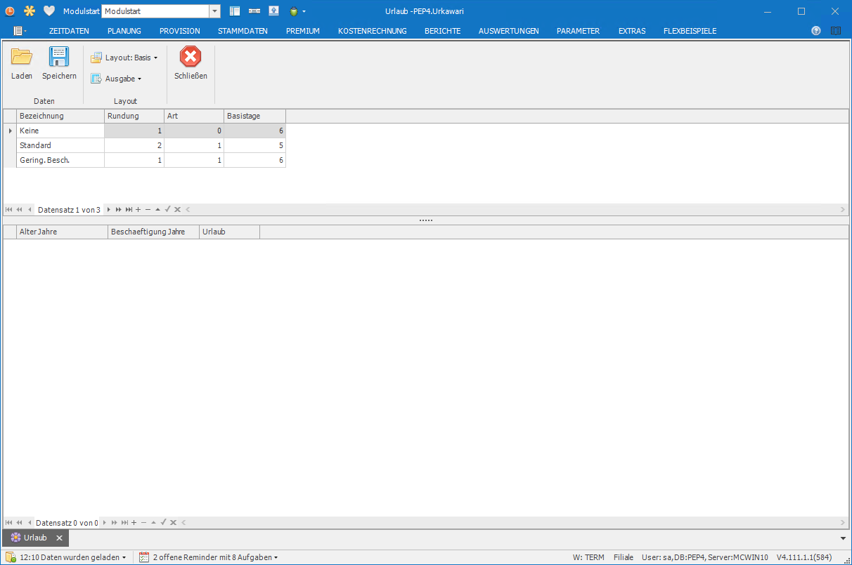 Modul zur Pflege des Rechenmodells für Urlaube. Die Berechnung ist hier beschrieben.