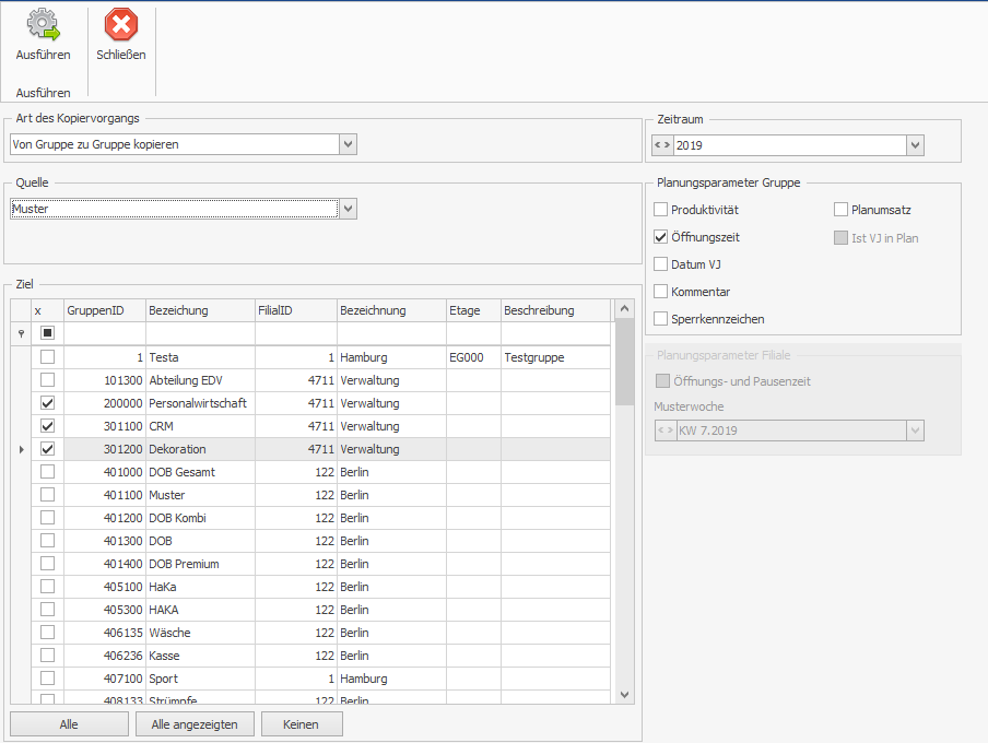 Um die Planung zu vereinfach, können Planungsparameter kopiert werden. So können Planungsparameter aus den Tagesparameter Gruppe und Tagesparameter Filiale von einer Gruppen auf andere kopiert werden, oder aus dem Vorjahr übernommen werden.