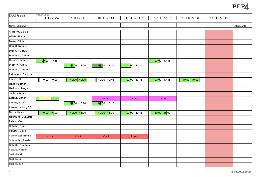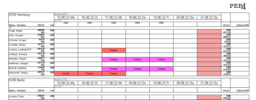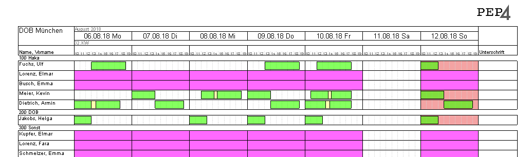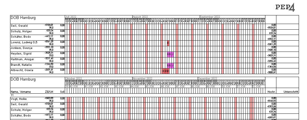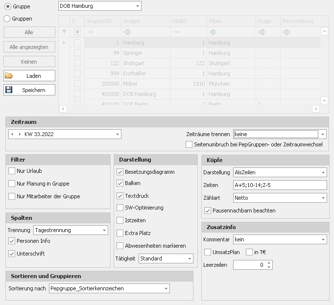Im Druck werden die Planungen angezeigt, und zwar nicht als „Springer“ sondern so, als wären sie in der zusammenfassenden Gruppe geplant worden. Damit ist es auch möglich, über alle Gruppen zu zählen. Es gibt noch einen weiteren Vorteil: Aushelfende Mitarbeiter einer Kassenplanung werden auch geladen und angezeigt.