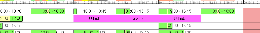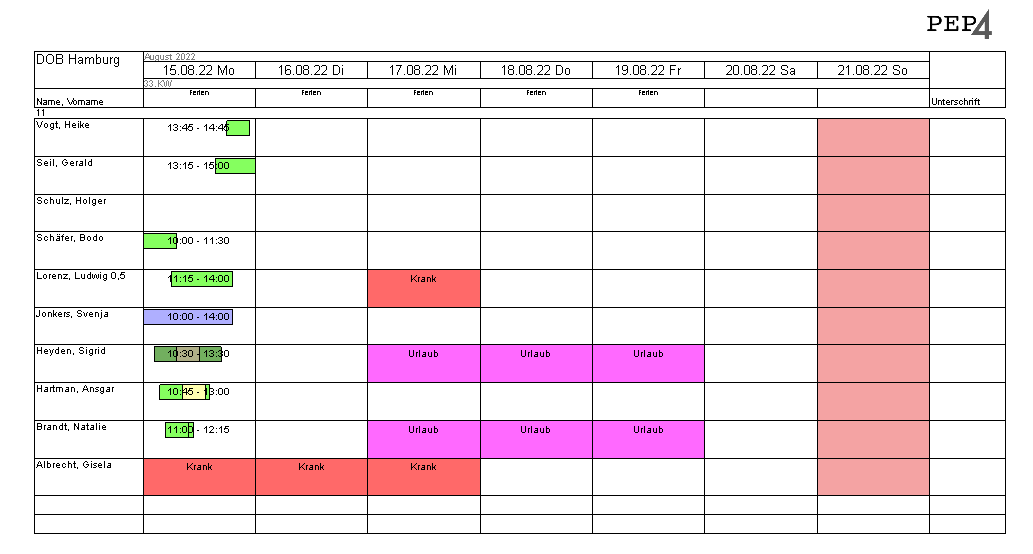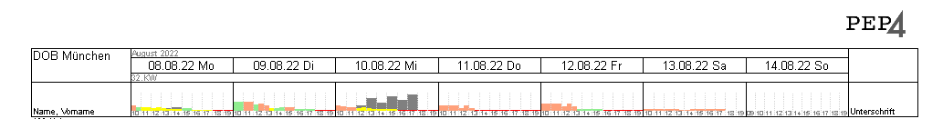 Balken können Dir wie in der Planung angezeigt werden. Magst Du lieber den Textdruck, dann aktiviere ihn. Hast Du Probleme, in der grafischen Darstellung ganztägige Planungen zu unterscheiden, dann aktiviere die SW-Optimierung damit ein Kürzel angedruckt wird.