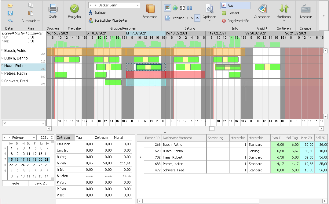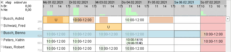Ist in den Optionen die Anzeige von Ist-Zeiten aktiv, so wird nicht mehr nur in Diagramm die Ist-Zeit angelegt, sondern auch in den Zellen der numerischen Ansicht. In der ersten Zeile sind dann das erste Kommen und das letzte Gehen zu sehen, darunter die Netto-Planung in der gewählten Gruppe.