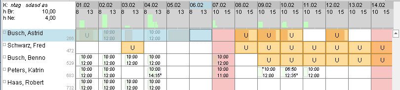 Und wenn der Platz noch immer nicht ausreicht, dann wird nur noch die Nettozeit angezeigt, und ein * weist auf eine Anwesenheit vor oder nach der angezeigten Zeit hin: