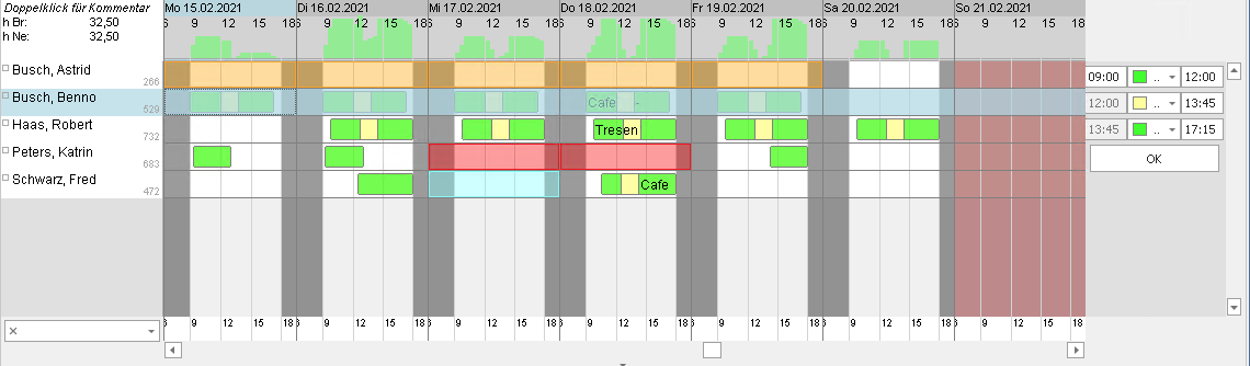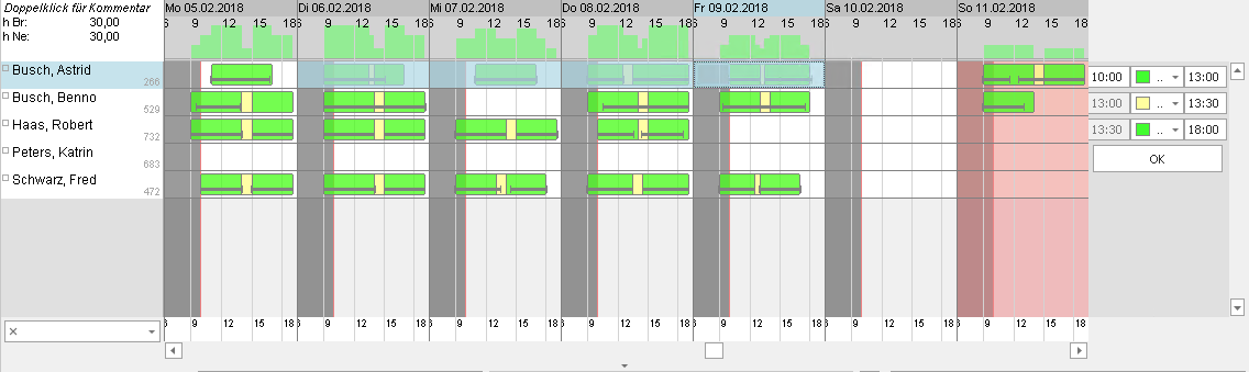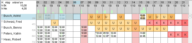 Wie bekannt kannst du mit den Tasten (1-0) Standardzeiten eintragen, ganztägige Abwesenheiten mit U, K oder F, mit R das Rollsystem, und kopieren und einfügen.
