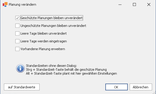 Neu ist der Dialog, der bei beim Überschreiben einer Planung erscheint - und nur, wenn du mehrere Tage überschreiben willst. Und das nur, wenn eine Planung vorhanden ist.