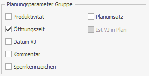 Mit dieser Funktion in Parameter kopieren kannst du folgenden Planungsparameter aus dem Vorjahr übernehmen. Wichtig: Als Vorjahr werden hier die Werte kopiert, die mit Du der Zuordnung "Datum VJ" vorgenommen hast.