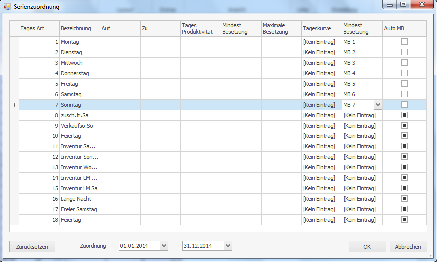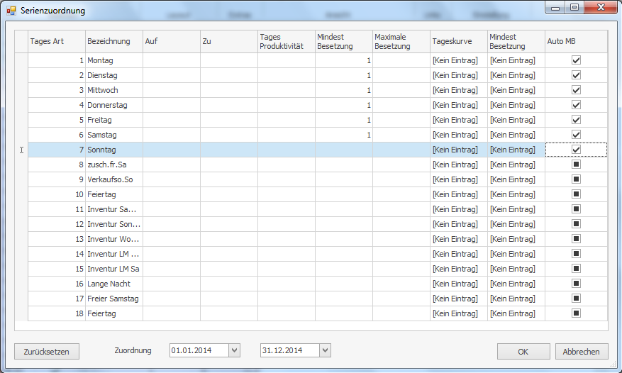 Um die automatische Berechnung der Mindestbesetzung zu aktivieren, muss das Feld Auto MB gesetzt sein. Über die Serie kannst Du das Feld aktivieren, und direkt auch den Wert der Mindestbesetzung für mehrere Tage eintragen.