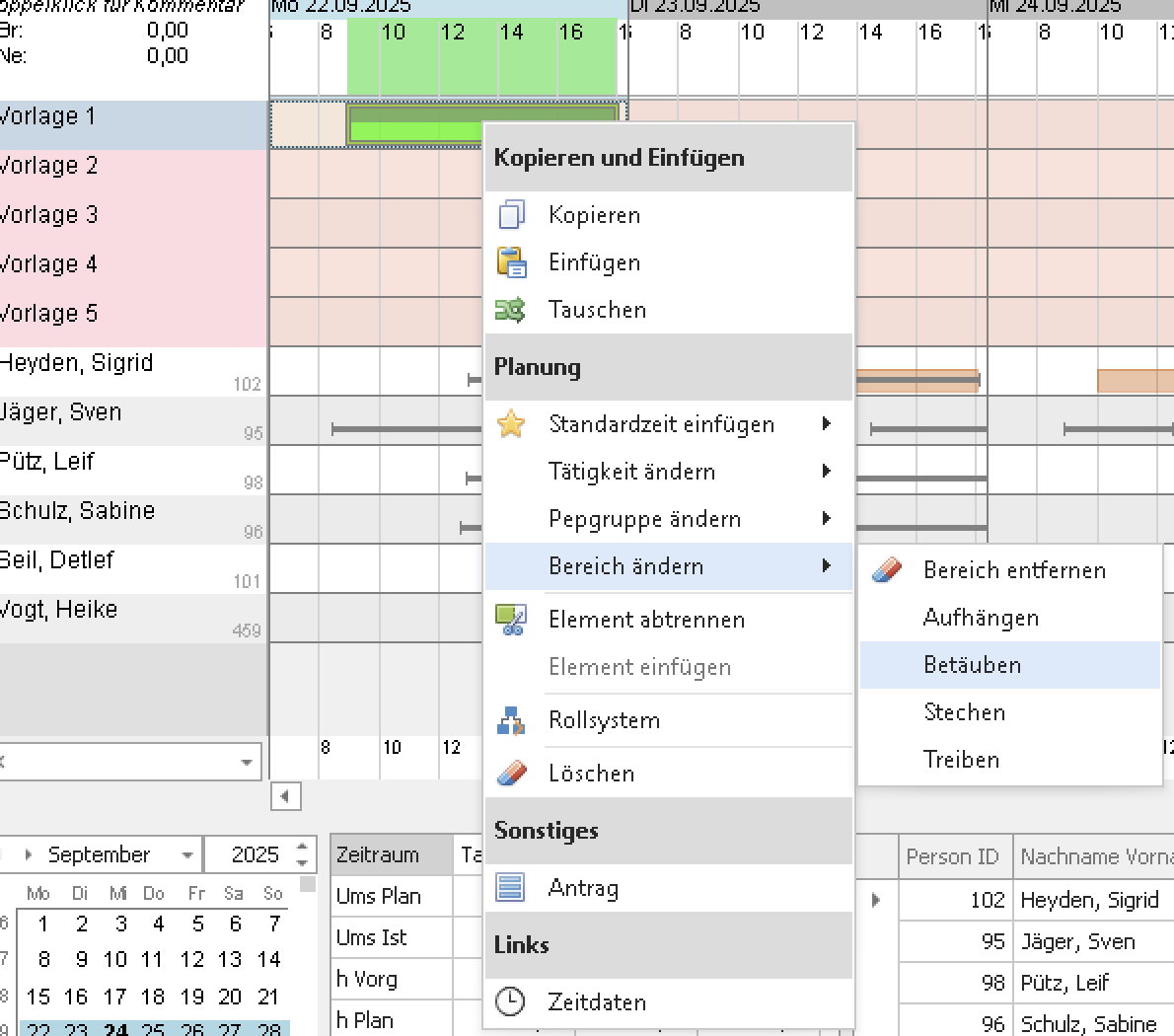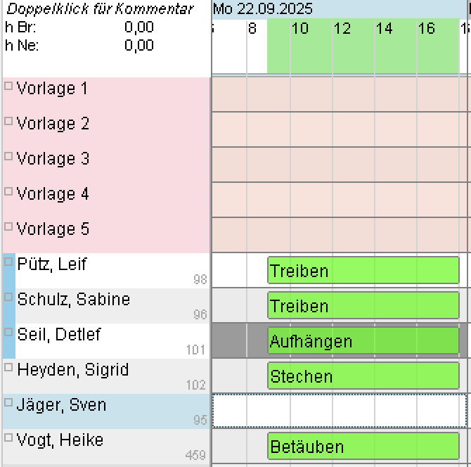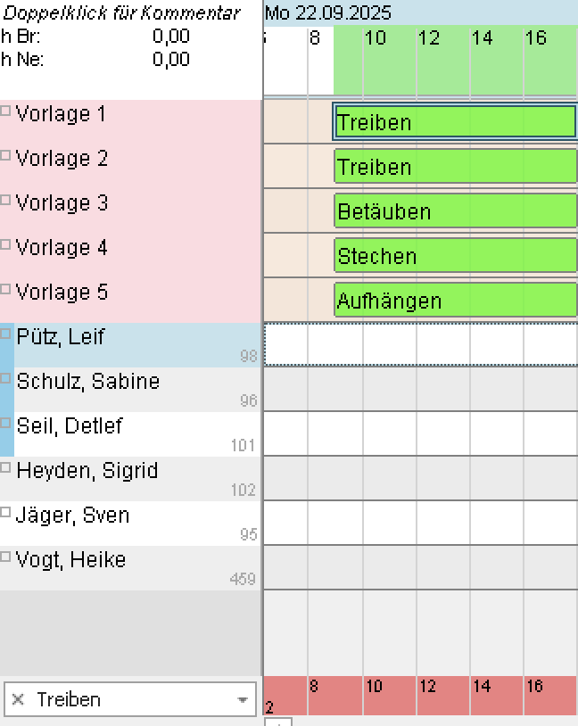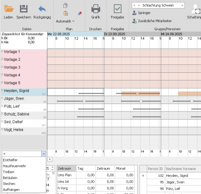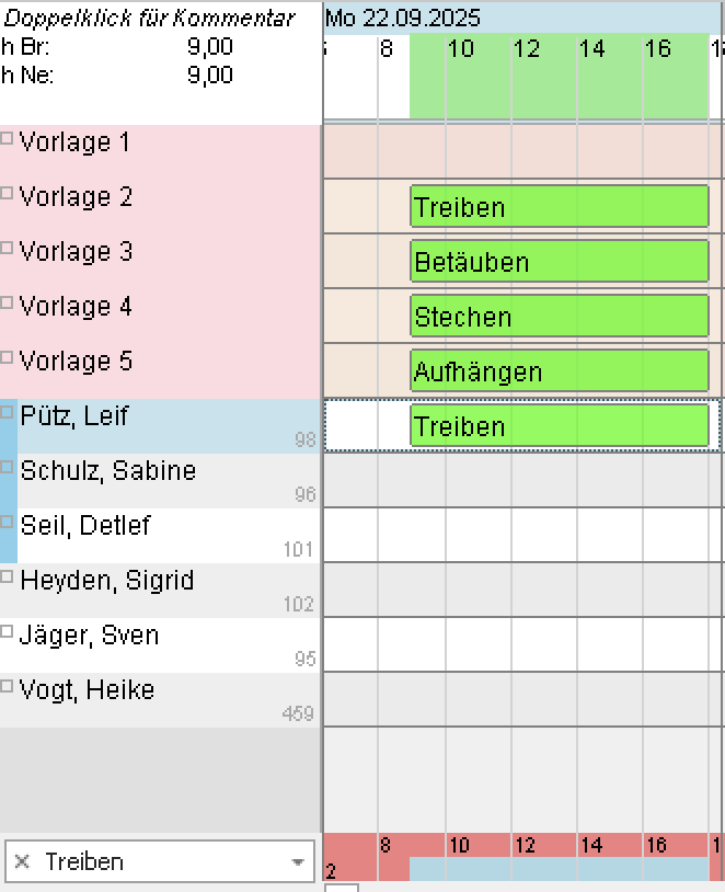 Schritt 5.3: Aufgabe zuweisen Drücke die Taste F12, um die oberste Vorlage der markierten Person zuzuordnen. Die Planung wird übertragen, und die nächste Aufgabe des Stapels wird automatisch ausgewählt, wobei die Mitarbeiter erneut sortiert werden.