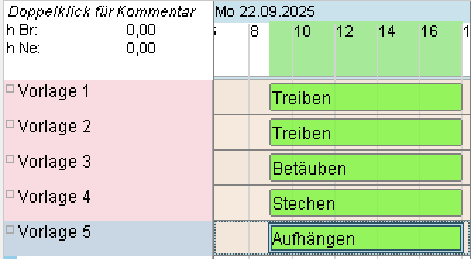 Nach diesen Schritten erscheinen in der PEP fünf Vorlagen, die bereits mit den Bereichen und Sonderaufgaben verknüpft sind und für die weitere Planung genutzt werden können.