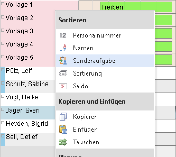 Schritt 5.1: Sonderaufgabe auswählen Wähle eine Sonderaufgabe in der Planung aus, um alle zugehörigen Mitarbeiter anzuzeigen. Diese können nach ihrem Nettofaktor sortiert werden, sodass die bestgeeigneten Mitarbeiter oben erscheinen.
