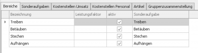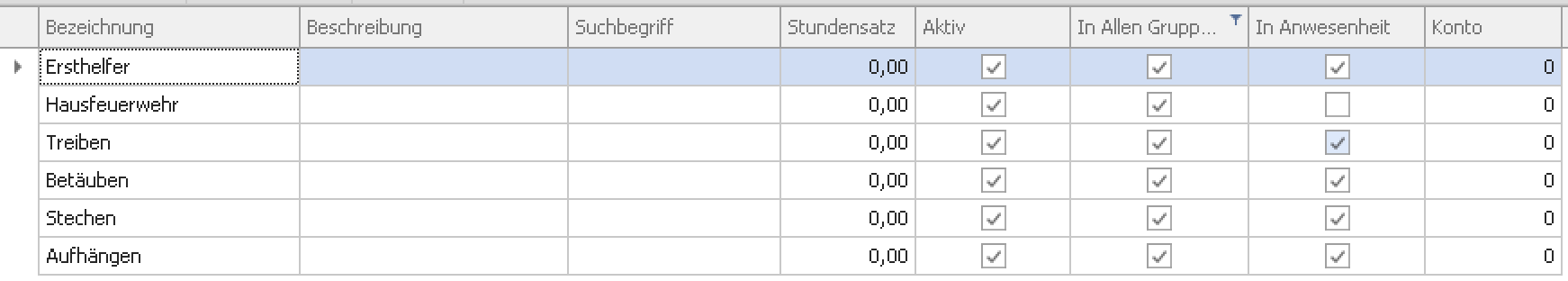 Schritt 1: Stationen anlegen Öffne das Modul „Sonderaufgaben“ (3015) und lege die Aufgaben an, die in der Gruppe besetzt werden sollen. Beispiel: Für Aufgaben wie „Treiben“, die mehrfach besetzt werden müssen, reicht es, die Aufgabe einmalig anzulegen.