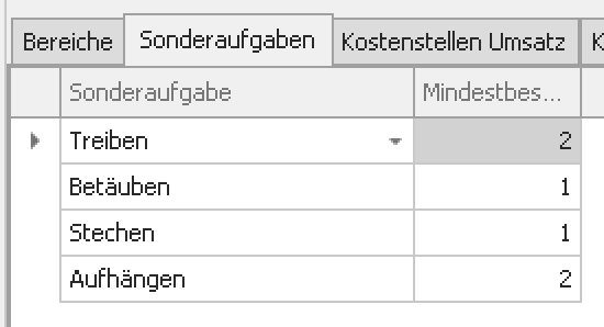 Schritt 2.2: Sonderaufgaben zuweisen Wechsle in das Register „Sonderaufgaben“ und füge die zuvor erstellten Aufgaben hinzu. Gib dabei die benötigte Anzahl an Personen für jede Aufgabe an.