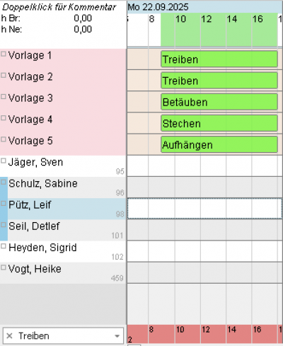Drücke die Taste F12 um die oberste Vorlage zuzuordnen. Die Planung wird auf die Person übertragen. Automatisch wird die Aufgabe der nächsten Planung des Stapels gewählt und die Personen entsprechend sortiert.