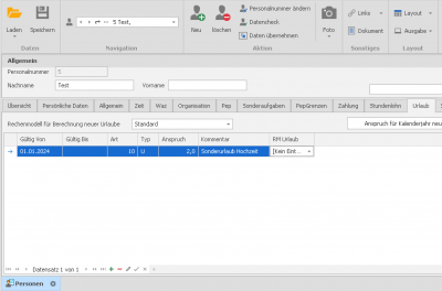 Es können beliebig viele Buchungen hinzugefügt werden, jedoch darf je Begindatum immer nur eine Urlaubsart bestehen, also nicht 2 mal ab 1.1.2024 die Art 10.