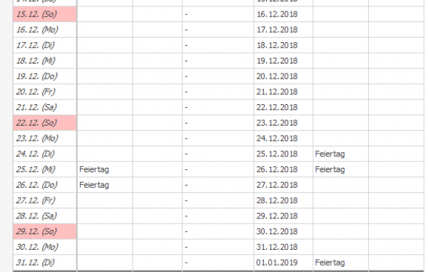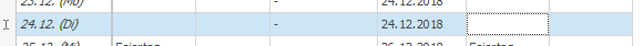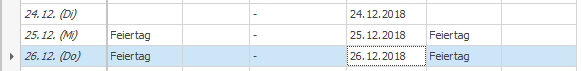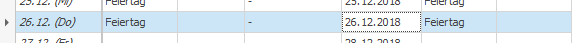 So kannst du jetzt leicht in die nächste Zeile springen und mit dem + auch hier die Zuordnung 26. zu 26. vornehmen. Beachte hier, dass automatisch auch der Feiertag aus dem Vorjahr angezeigt wird: