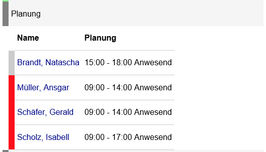 Zeigt die geplanten Mitarbeiter an. Der Farbindikator zeigt dabei folgende Informationen: