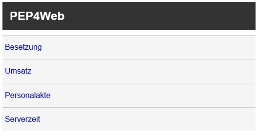 Der Webservice wird über die inidateien und die Rechteverwaltung in PEP4 gesteuert. Die Rechteverwaltung und die Lizenzierung bestimmen den Umfang des Hauptmenüs: