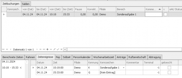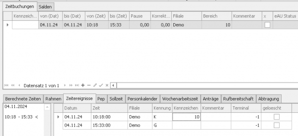 Bei einer Zeitbuchung werden 3 Parameter gefüllt: Terminal, Filiale, Kennzeichen