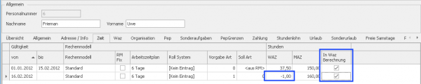 Im Modul Stammdaten Personen im Register Zeit muss die WAZ auf -1 gestellt werden. In dem Fall wird die Wochenarbeitszeit für die Berechnung aus der Tabelle WAZ statt aus dem Feld WAZ übernommen.