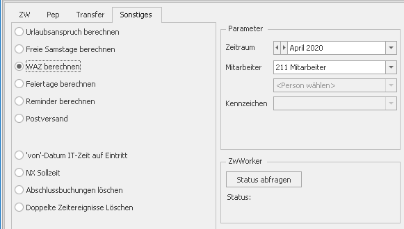 Welche Zeiten in die Berechnung einfließen, wird mit der Einstellung WAZ_CALC_KZ festgelegt. Hier werden die Konten hinterlegt, z.B. 5,7,8,18,23.
