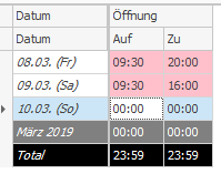 Die Öffnungszeiten werden in Tagesparameter Gruppe gepflegt: