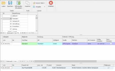 Der Eintrag Zeit: 6.08, Pause: 0.5 bedeutet, dass nach 6.08 Stunden Basiszeit (also ca. 6:05) eine halbe Stunde Pause abgezogen wird. Beim Vergleich wird ist die „ab“-Zeit eingeschlossen, also ab 6 Stunden bedeutet, dass bei einer Basiszeit von 6 Stunde die Pause gewählt wird.