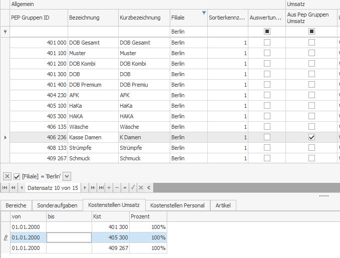 2) als Kostenstellen Umsatz gibst du die GruppenIDs an, aus denen die Summe sich zusammensetzen soll. Dabei kannst du mit der Spalte Prozent steuern, welcher Anteil des Umsatzes in die Summe einfliessen soll.